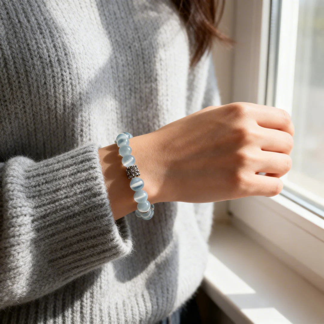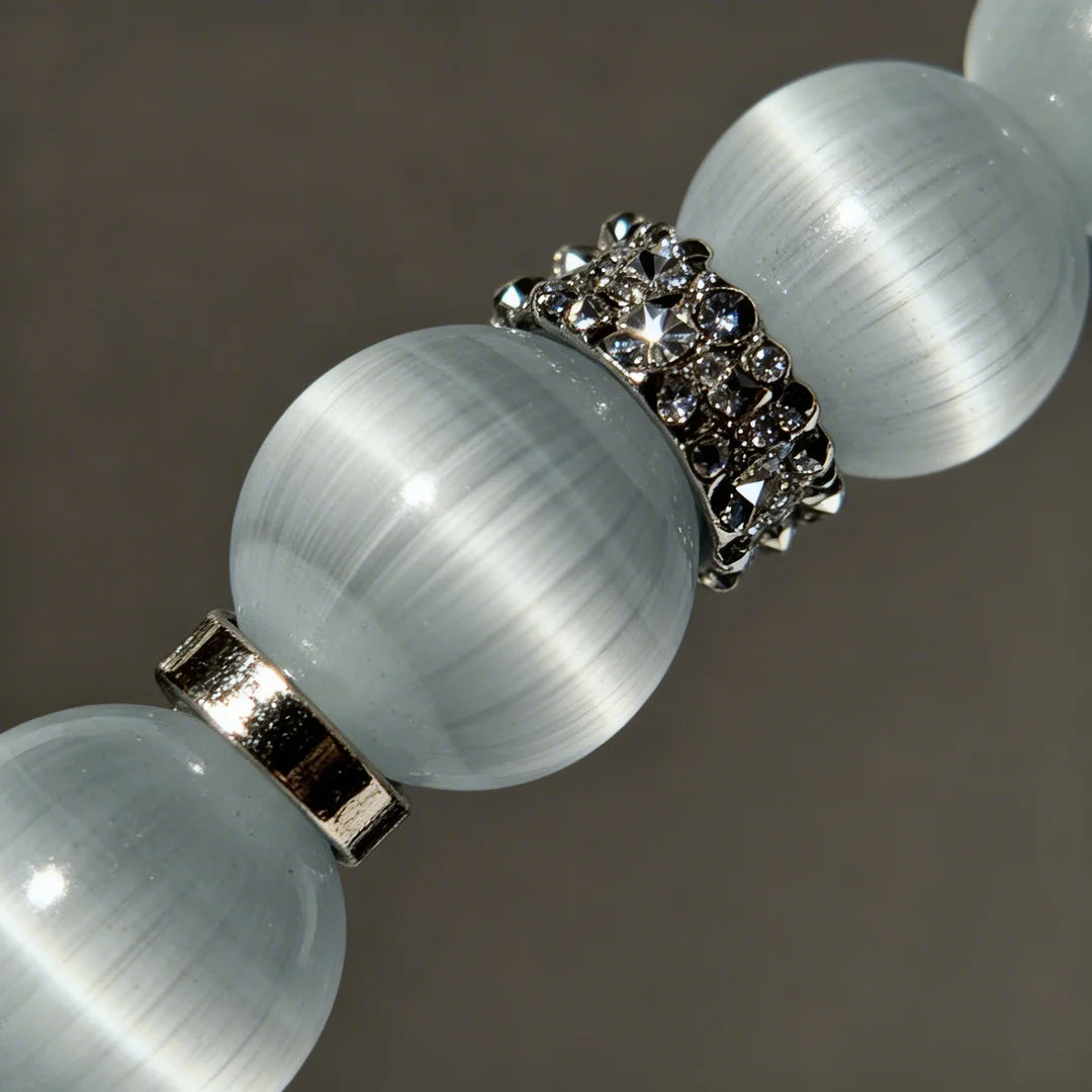 Moonlight Glow Cat’s Eye Quartz Bracelet – Silver Spacer & Sparkling Bead Elegance