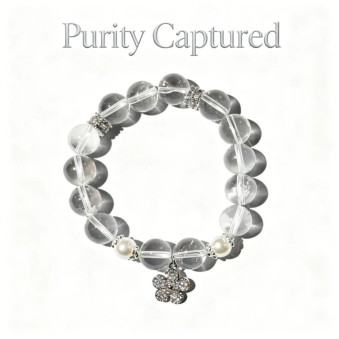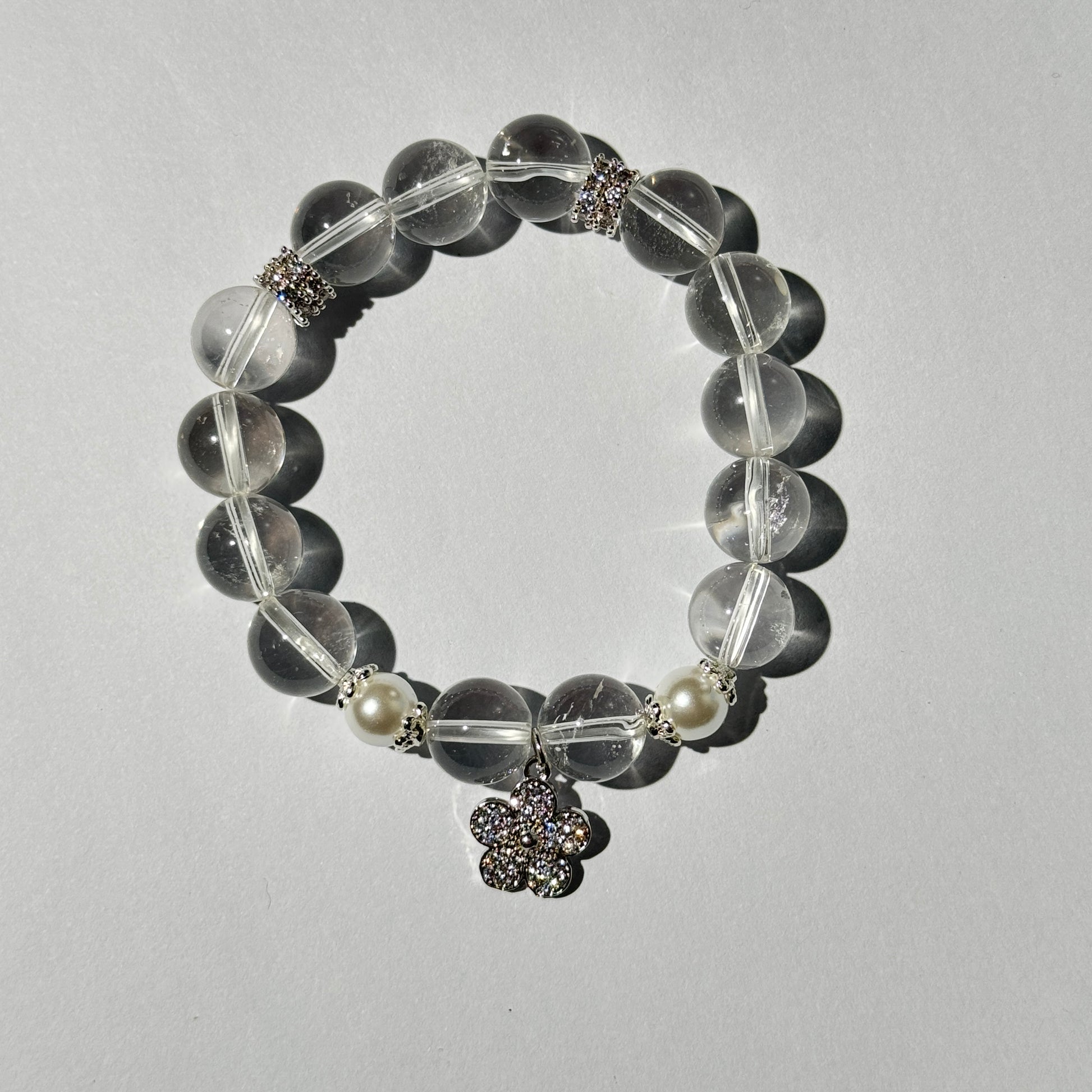 Embrace clarity and grace. This elegant bracelet combines sparkling clear crystals for energy cleansing, soft pearls for purity, and a delicate crystal flower charm. Simple, luminous, and designed to capture light—and a moment of calm—with every wear.
